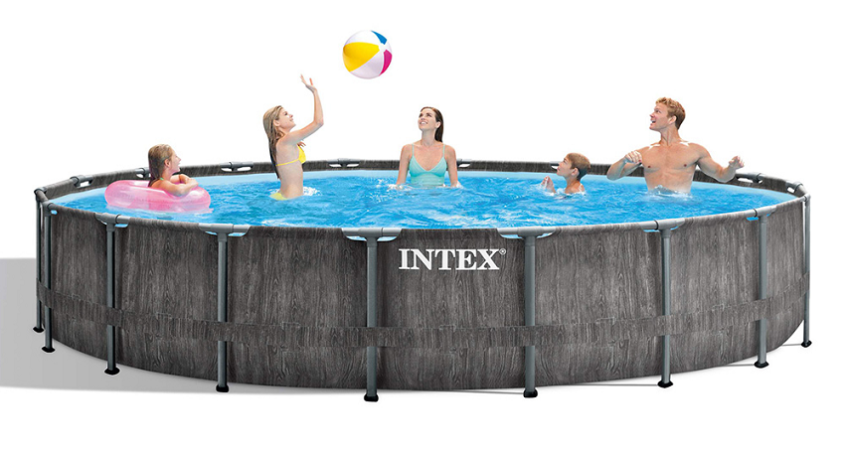 Piscina Intex 26744 Prism Frame GREYWOOD, con liner migliorato di ultima generazione e colore effetto legno grigio, struttura maggiorata in acciaio e rivestita da uno strato anti ruggine. Ideale per momenti in famiglia o lunghe feste con amici.