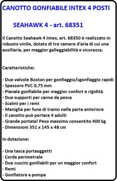 Il canotto gonfiabile INTEX "SEAHAWK 400" è ampio e confortevole, l' ideale per uscite in canotto in massima sicurezza, per tutta la famiglia o il gruppo di amici.