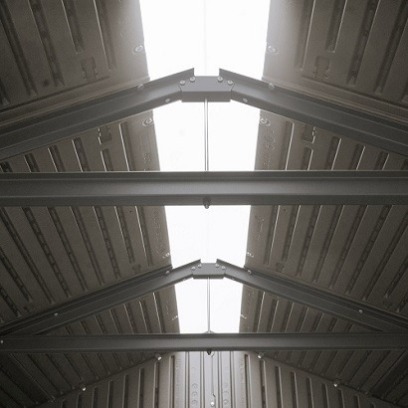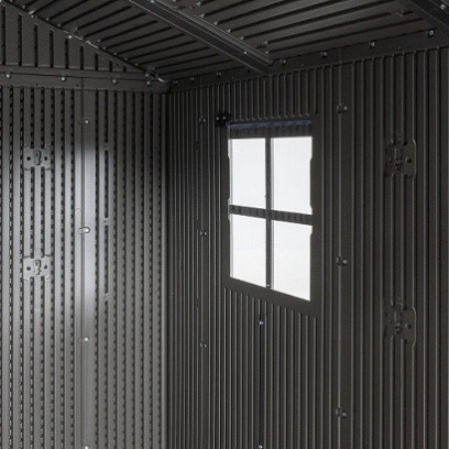 Casetta in polietilene alta densità a doppia parete (HDPE). Colore grigio con venature effetto legno, finitura spazzolata ruvida. Tetto realizzato con capriate in acciaio e dotato di lucernario a tutta lunghezza. Porta rinforzata con componenti acciaio; chiusura con chiavistello.