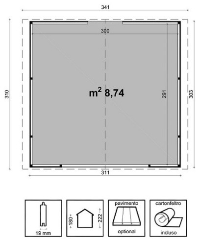 Casetta di legno in Abete grezzo non trattato Superficie Pavimento interna: mq 8,74 Altezza Massima: 222 cm