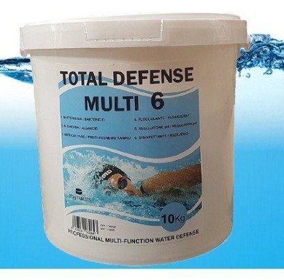 Per iniziare a sfruttare al meglio la vostra piscina, ed evitare la fastidiosa comparsa di micro-alghe ed acqua torbida, è indispensabile l' utilizzo dei Prodotti chimici. Questi affiancheranno le Pompe / Filtro nella loro azione depurativa, che da sola non può bloccare la proliferazione batterica dovuta a sole, alte temperature ed agenti esterni (motle persone in acqua, zanzare, ecc.). Per mantenere sempre l'acqua in ottimo stato si consiglia dunque di trattarla con le pastiglie multifunzione TOTAL DEFENSE, un unico prodotto in grado di effettuare tutte le azioni necessarie al mantenimento dell' acqua della vostra piscina.