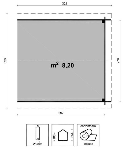 Ha una dimensione a terra di 297 x 276 cm con perline tetto da 16mm.